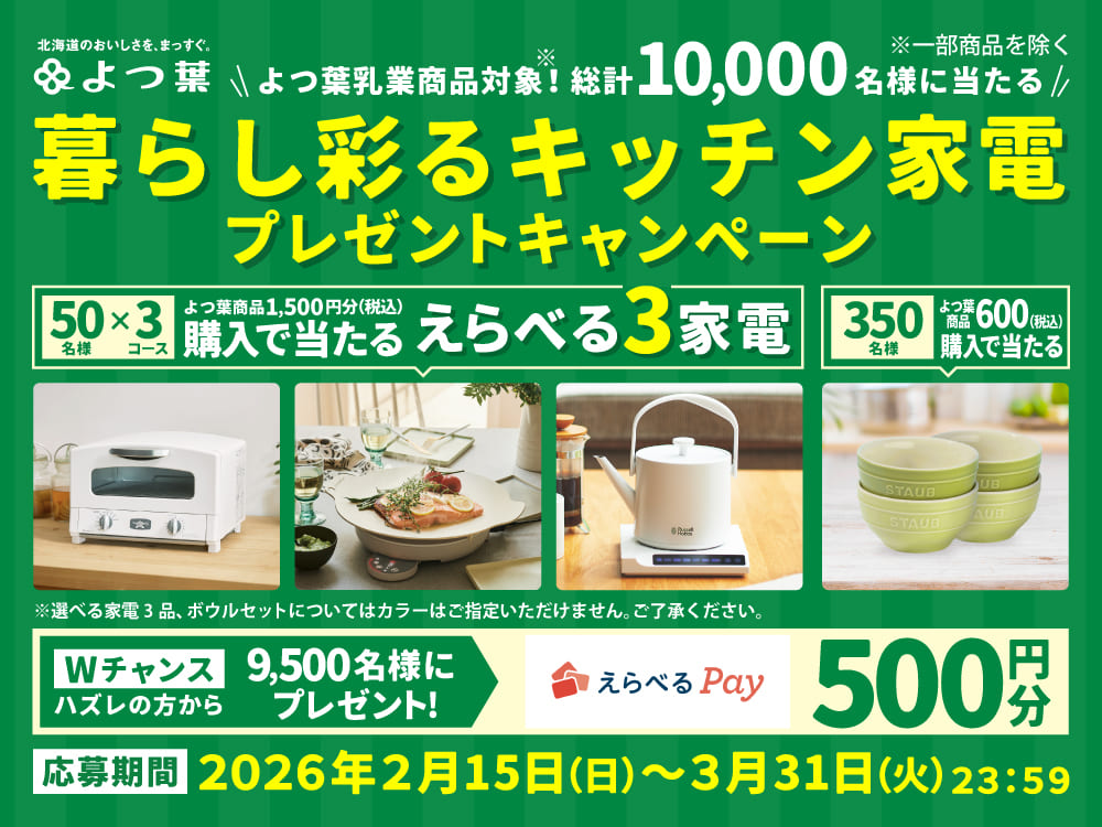 【重要】製品回収のお詫びとお知らせ カテゴリで探す すべての商品 牛乳類 すべての商品 牛乳 低脂肪・無脂肪牛乳・加工乳 ロングライフ牛乳類 バター類 すべての商品 バター(加塩・減塩) バター(食塩不使用・無塩) 発酵バター パンにおいしいシリーズ バター(伝統製法) 業務用バター チーズ類 すべての商品 シュレッドチーズ ブロックチーズ カマンベールチーズ ブルーチーズ チェダーチーズ ゴーダチーズ クリームチーズ チーズスプレッド ナチュラルチーズ プロセスチーズ スライスチーズ おつまみ用チーズ 業務用チーズ 乳飲料 すべての商品 カフェオレ ティーオレ よつ葉オレ カフェインレスカフェオレ ロングライフ牛乳類 ヨーグルト すべての商品 飲むヨーグルト カップヨーグルト プレーンヨーグルト プロテインヨーグルト 機能性表示食品ヨーグルト 粉乳 すべての商品 スキムミルク 脱脂粉乳 全粉乳 バターミルクパウダー 業務用粉乳 アイスクリーム すべての商品 カップアイス バーアイス パンケーキミックス レトルトスープ よつ葉のギフト 焼菓子・冷凍パン 用途・特徴で探す おすすめ 選べるセット 会員限定 業務用 製菓・製パン お試しセット 定期便 日々の食事に 特別な時間に 健康づくりに 防災備蓄に ランキング RANKING 総合 牛乳類 バター類 チーズ類 ヨーグルト類 よつ葉のギフト No.1 よつ葉北海道十勝シュレッドチーズ(1kg)[要加熱] 2,523 円(税込) 定期便あり No.2 よつ葉北海道脱脂粉乳(1kg) 1,284 円(税込) 定期便あり No.3 北海道スキムミルク(150g) 306 円(税込) 定期便あり No.4 よつ葉特選北海道牛乳(1000ml)[常温保存可能品] 370 円(税込) 定期便あり No.5 よつ葉の選べるお試しセット※クーポン適用で送料無料 3,800 円(税込) No.6 よつ葉北海道全粉乳(700g) 1,409 円(税込) 定期便あり No.7 よつ葉の北海道バターミルクパンケーキミックス(450g) 623 円(税込) No.8 よつ葉特選北海道牛乳(200ml)[常温保存可能品]×24本(1ケース) 2,748 円(税込) 定期便あり No.9 【選べる】よつ葉 北海道アイスクリーム12個セット【送料負担ナシ】 6,696 円(税込) 6,026 円(税込) 数量限定 No.10 よつ葉北海道十勝 なめらかクリームチーズ 289 円(税込) もっと見る No.1 よつ葉特選北海道牛乳(1000ml)[常温保存可能品] 370 円(税込) 定期便あり No.2 [キャップ付]特選よつ葉低脂肪牛乳(1000ml) 305 円(税込) No.3 [キャップ付] 特選よつ葉4.0牛乳(1000ml) 373 円(税込) No.4 よつ葉特選北海道牛乳(200ml)[常温保存可能品]×24本(1ケース) 2,748 円(税込) 定期便あり No.5 [キャップ付]生産者指定よつ葉牛乳(1000ml) 380 円(税込) No.6 よつ葉ミルク苺(200ml)[常温保存可能品]【単品】 108 円(税込) No.7 よつ葉ミルク紅茶(200ml)[常温保存可能品]【単品】 108 円(税込) No.8 よつ葉ミルク珈琲(200ml)[常温保存可能品]【単品】 108 円(税込) No.9 よつ葉特選北海道牛乳(1000ml)[常温保存可能品]×12本(1ケース)【送料込み】 5,336 円(税込) 定期便あり No.10 よつ葉特選北海道牛乳(200ml)[常温保存可能品]【単品】 118 円(税込) もっと見る No.1 よつ葉バター(加塩)(150g) 442 円(税込) No.2 よつ葉の贈りもの《チーズとバターの食べ比べセット》SHーC【ギフトセット】 3,888 円(税込) 3,499 円(税込) No.3 北海道発酵バター(125g)[北海道限定販売] 637 円(税込) No.4 よつ葉パンにおいしい発酵バター(100g) 396 円(税込) No.5 よつ葉バター(食塩不使用)(150g) 464 円(税込) No.6 北海道よつ葉バター(125g)[北海道限定販売] 583 円(税込) No.7 よつ葉パンにおいしいよつ葉バター(100g) 366 円(税込) No.8 よつ葉パンにおいしいはちみつ&バター(100g) 470 円(税込) No.9 よつ葉発酵バター〔ビン入り〕(113g) 816 円(税込) No.10 よつ葉パンにおいしいよつ葉バターとひまわりオイル(100g) 361 円(税込) もっと見る No.1 よつ葉北海道十勝シュレッドチーズ(1kg)[要加熱] 2,523 円(税込) 定期便あり No.2 よつ葉北海道十勝 なめらかクリームチーズ 289 円(税込) No.3 北海道十勝 クリームチーズ&瀬戸内レモン 100g 289 円(税込) 新商品 No.4 よつ葉の贈りもの《チーズとバターの食べ比べセット》SHーC【ギフトセット】 3,888 円(税込) 3,499 円(税込) No.5 よつ葉北海道十勝 スモークチーズ 257 円(税込) No.6 よつ葉北海道十勝 3種のチーズ《贅沢モッツァレラブレンド》 120g 498 円(税込) No.7 よつ葉北海道十勝 3種のチーズ《濃厚コク旨ブレンド》200g 751 円(税込) No.8 よつ葉北海道十勝 チェダー 100g 392 円(税込) No.9 よつ葉 北海道十勝 熟成ゴーダ 1,000 円(税込) 数量限定 ネット限定 No.10 よつ葉 北海道十勝 ゴーダ 100g 402 円(税込) もっと見る No.1 よつ葉北海道十勝生乳100 プレーンヨーグルト とろっとなめらか (400g) 313 円(税込) No.2 よつ葉 DESSERT YOGHURT(デザートヨーグルト)100g×6個(1ケース) 827 円(税込) 定期便あり No.3 選べるよつ葉ののむヨーグルト6本セット 1,222 円(税込) No.4 北海道のむヨーグルトベリーミックス250g【ドリンク】 205 円(税込) No.5 たんぱくリッチ0(ゼロ)のむヨーグルト いちご 250g×6本(1ケース) 1,275 円(税込) 定期便あり No.6 よつ葉北海道十勝生乳100 プレーンヨーグルト とろっとなめらか (400g)×6個(1ケース) 1,822 円(税込) 定