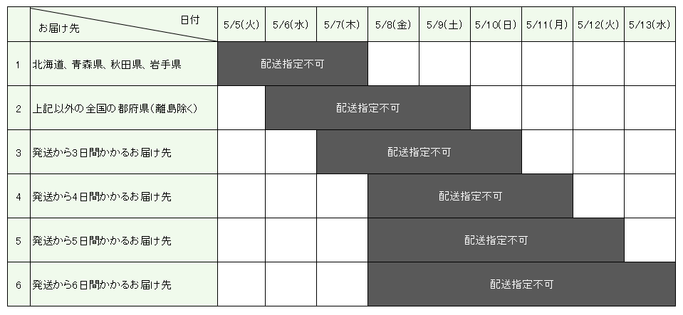 ・5月5日(火)から5月7日(木)配送指定での発送はできません。